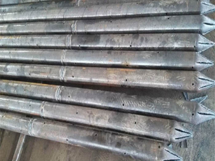 超前小導(dǎo)管一般采用直徑38~50mm的無縫鋼管制作。在小導(dǎo)管的前端做成約10cm長的圓錐狀,在尾端焊接直徑6~8mm鋼筋箍。距后端100cm內(nèi)不開孔,剩余部分按20~30cm梅花形布設(shè)直徑6mm的溢漿孔。